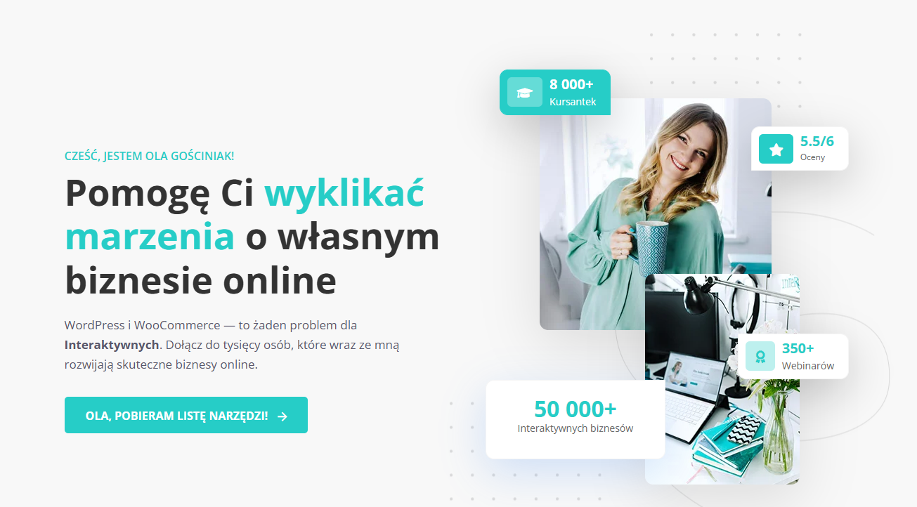 Twórczyni bloga "Jestem Interaktywna". Pomaga kobietom stawiać pierwsze kroki w budowaniu stron internetowych i zarabianiu online. Jej kursy są praktyczne, przejrzyste i bardzo dobrze oceniane przez społeczność.